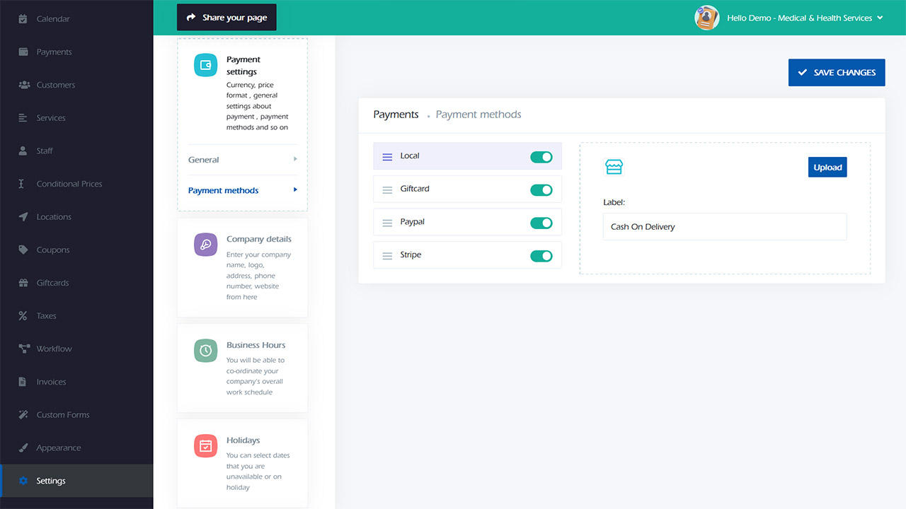 Local payment: This payment method stands out among other payment methods as it does not necessitate any online payment. By utilizing this method, your customers can schedule appointments without having to make any payments upfront. If you prefer to receive payment for appointments directly from your customers, then this payment method is well-suited for your needs.