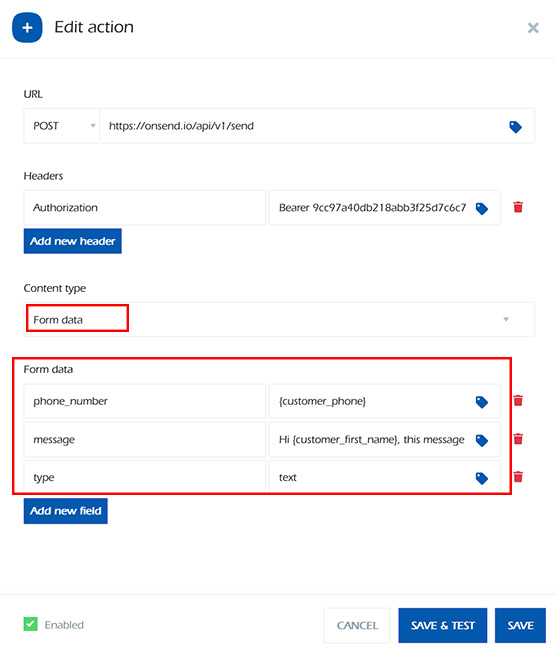 Like the JSON Content type, the POST URL and Header remain the same; the only difference is that the content type is set to “Form Data,” allowing you to easily include any Dynamic content in the form.