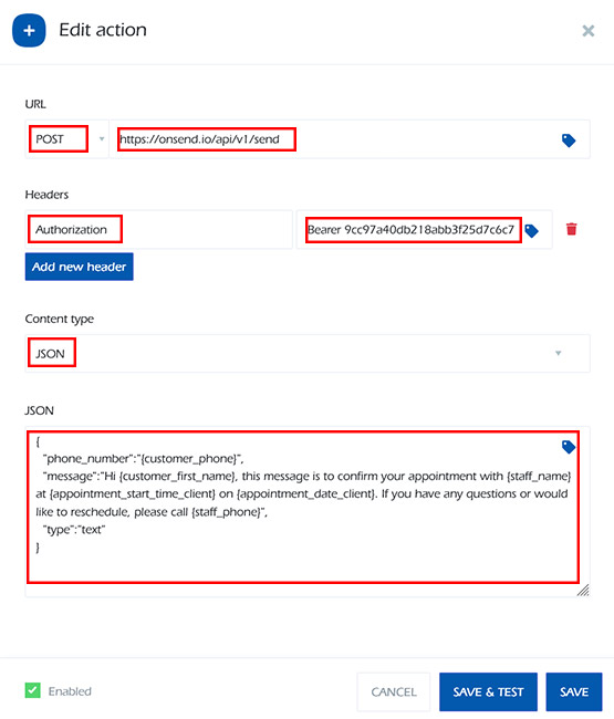 5. Add new header, enter “Authorization“, and set the value to “Bearer TOKEN“, where TOKEN represents your OnSend device token, for example, 9cc97a40db218abb3f25d7c6c728e2ed8…..